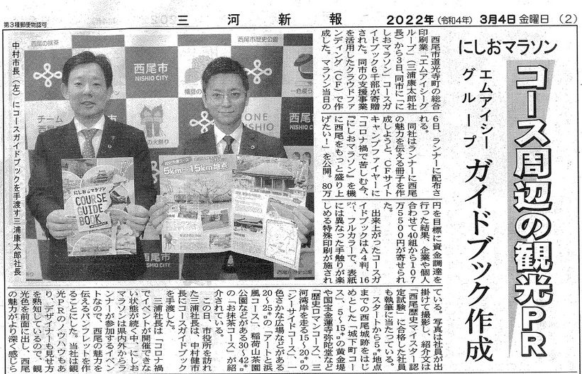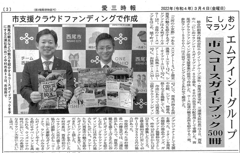 2022年03月04日(金) 愛三時報・三河新報ににしおマラソンコースガイドブック寄贈の記事が掲載されました にしおマラソンコースガイドブックを西尾市に寄贈した際の記事を2022年3月4(金)の愛三時報・三河新報に掲載して頂きました。