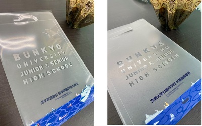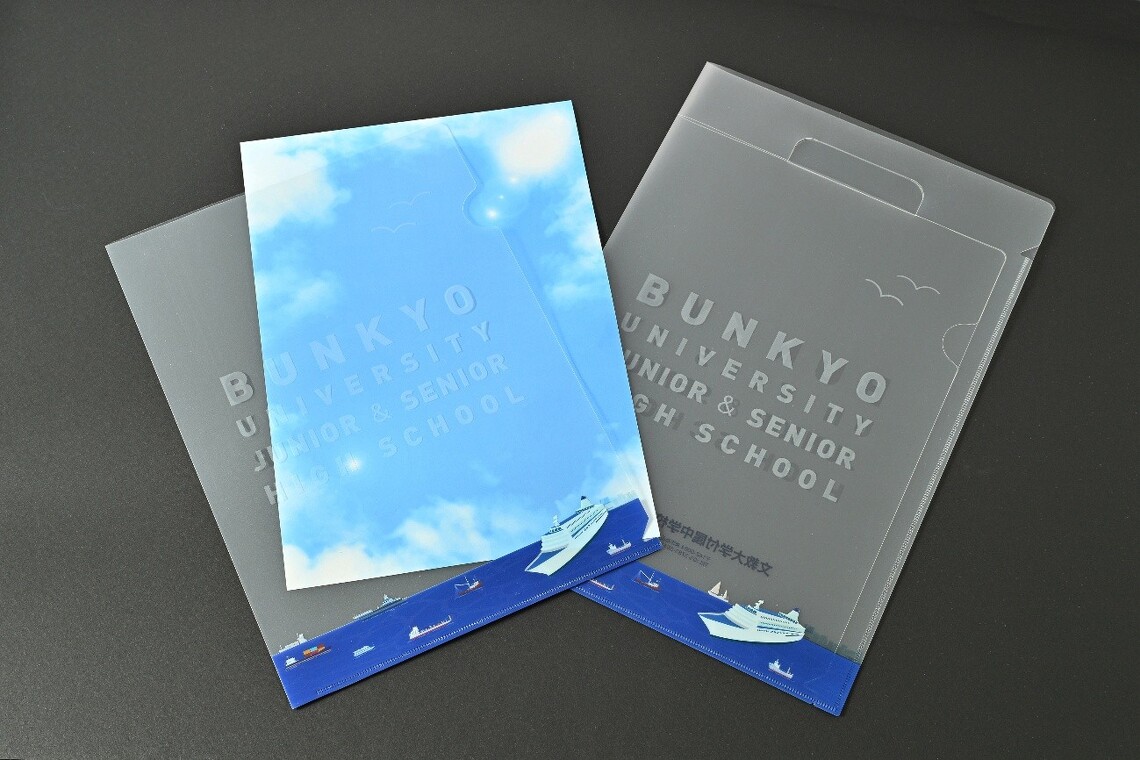 学校案内配布用として採用された、擬似エンボス加工入りの手提げクリアファイル。